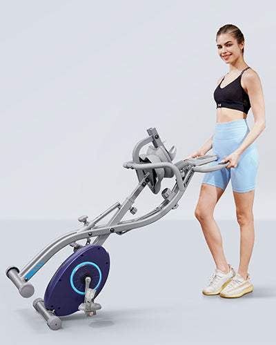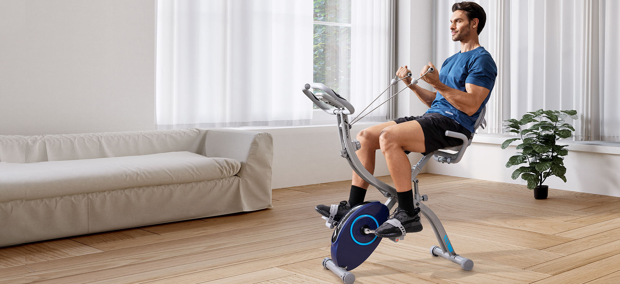 This innovative, foldable design offers upright and recumbent riding modes, as well as arm and back training.