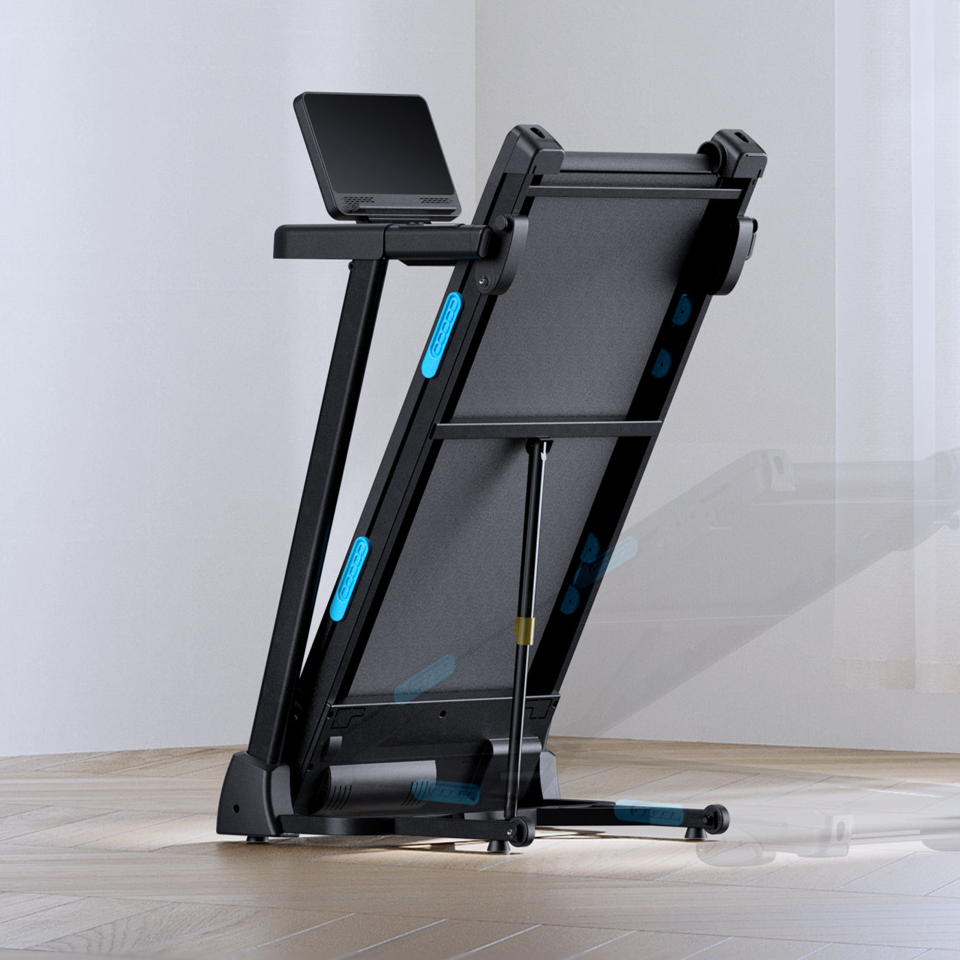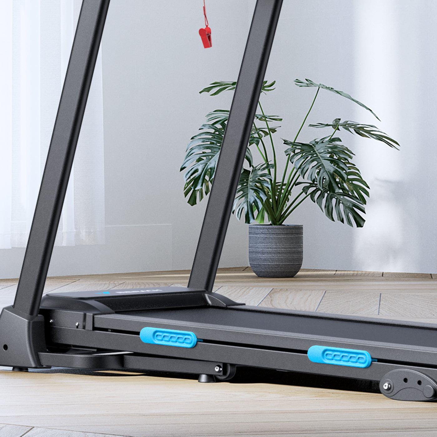 The foldable treadmill features a 5-layer treadbelt and 6 shock-absorbing silicone columns, providing complete protection for your knees and ankles.